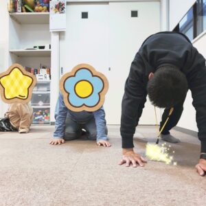 ①動物歩き ②腕立て伏せ ③はいはい ④お手玉キャッチをおこないました。