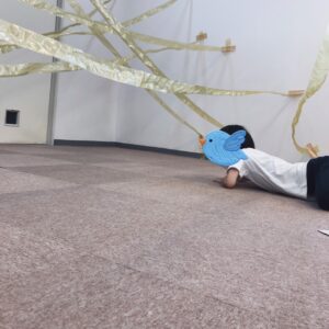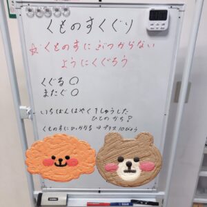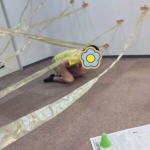 すずらんテープを蜘蛛の巣に見立てて行いました。