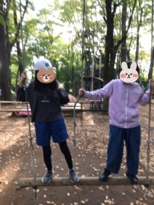 「手は絶対に離さない事!」「次は隣のロープに左足を乗せて!」