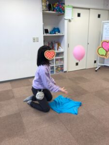 風船に気を取られなかなか、ビブスを掴んで着脱することができない子や