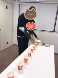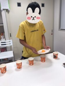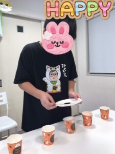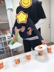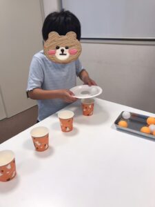 多くの紙コップにピンポン玉を入れたお友達の勝利🥇