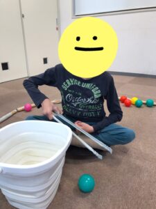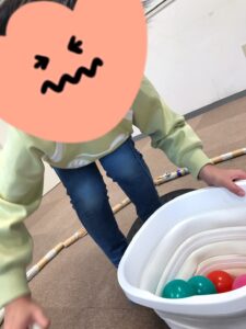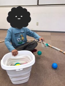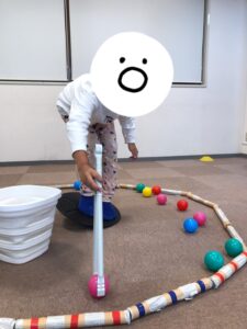 活動内容はバランスボードに乗りトングを使って拾った ボールをバケツに入れます。
