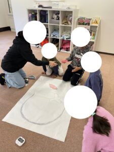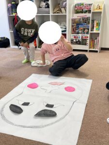 顔のパーツを受け取り、どこに置けばいいのか周りの友だちの声を真剣に聞きながらおこなっていました!