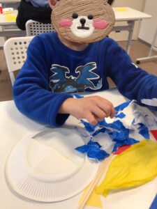 千切った折り紙に糊で塗り、紙皿に貼り付けました。
