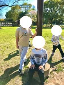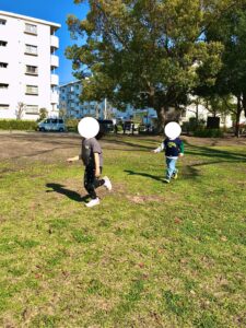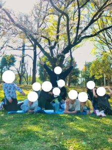 我々もブルーシートで陣地を確保し、春の健やかな陽気の下みんなで鬼ごっこをしました!
