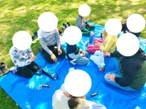 元気に遊んだ後は、ブルーシートの上でみんなで桜を見ながらおやつtimeをとりました。