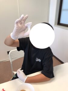 マシュマロを立ててのせてみたり、ズレてしまったマシュマロを触って手袋にくっついて遊んでみたり、楽しんで作っていました😊